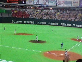 ホークスvs日ハムでした。知っている選手はダルビッシュと新垣でした。あ、どっちも先発投手でした。投手は華ですなあ、必ずファンがいるから自然と素人の耳にも情報が入ってきます。始まる前の盛り上がる感じは大物アーティストのライブ前の緊張感に似ている・・・しかし時間通り始まるところはライブとは大違い!感動!その前にお姉さんたちがダンスしたり、子供たちがハリーホークたちとグラウンドに出てきたり、始球式あったり、今までテレビでしか観たことないようなことが目の前で行われていることにわくわくしました。子供たちがうらやましかったです!